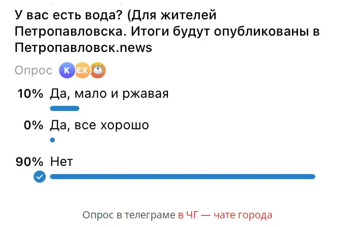 Однако жители многих районов Петропавловска жалуются, что воды нет. В некоторых районах из кранов не идет даже техническая вода, которая периодически появлялась вчера и сегодня утром. А та, что все-таки где-то уже появилась, совершенно не пригодна даже для мытья полов. Потому что от нее идет странный запах.