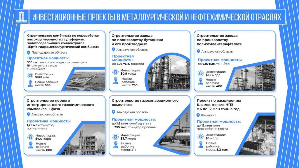 - В Атырауской области идёт реализация трёх нефтехимических проектов. Планируется строительство завода по производству бутадиена и его производных мощностью до 305 тыс. тонн продукции в год. Объём инвестиций – 900 млн долларов, предусмотрено создание 750 постоянных рабочих мест. Ввод предприятия в эксплуатацию запланирован на 2028 год.