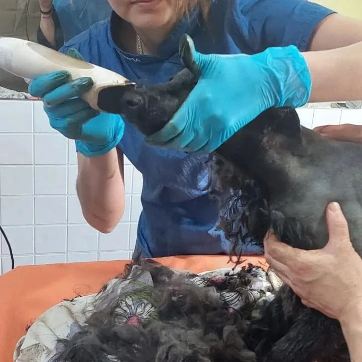 Общими усилиями им удалось вытащить собаку из ямы с вязким гудроном. Животное было все измучено. Его доставили к ветеринарам, где попытались отмыть, а затем состригли всю шерсть.