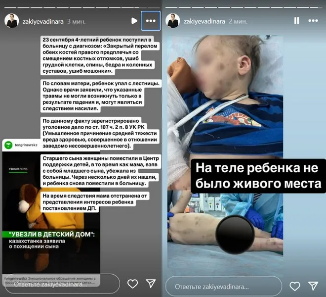 «По словам матери ребенок упал с лестницы. Однако врачи заявили, что указанные травмы не могли возникнуть только в результате падения и могут являться следствием насилия. По данному факту зарегистрировано уголовное дело по статье 107 ч 2 п 8 УК РК (Умышленное средней тяжести вреда здоровью совершенное в отношении несовершеннолетнего)», - сообщила Закиева.
