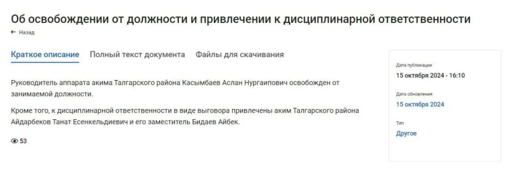 Ранее за ненадлежащее исполнение своих обязанностей акима Талгара Бахыта Куришбекова и заместителя акима Талгар Сагындыка Матана освободили от занимаемых должностей. В приказе главы области также сказано, что за ослабление контроля на вверенной территории акиму Талгарского района Танату Айдарбекову объявили дисциплинарное наказание в виде строгого выговора.