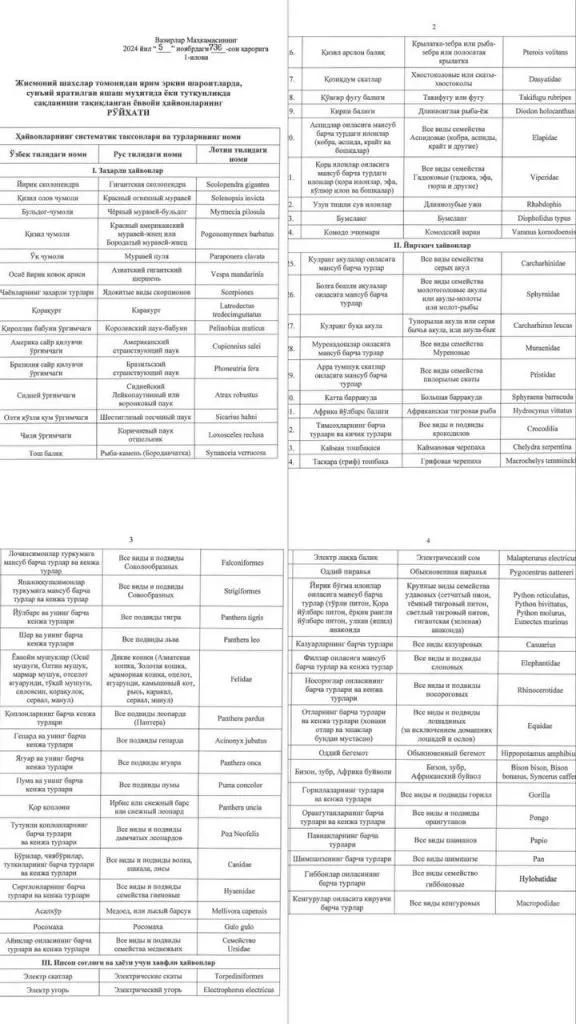Местный Telegram-канала Uzauz опубликовал список зверей, которых запрещено содержать физическим лицам в неволе или искусственных местах обитания. Среди них коричневый азиатский лев, разные виды пауков, все виды и подвиды крокодилов, грифовая черепаха и другие.