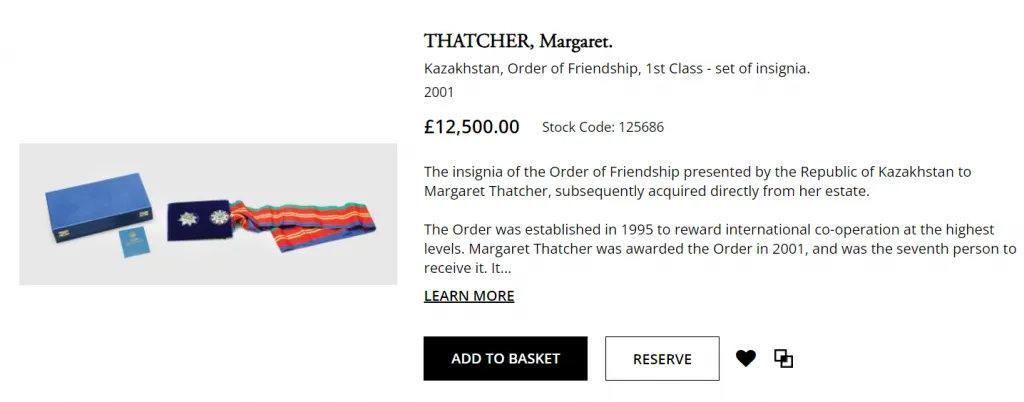 На британской интернет-платформе по продаже антиквариата выставили на продажу орден «Достык», который вручили бывшему премьер-министру Великобритании Маргарет Тэтчер, сообщает CMN.KZ