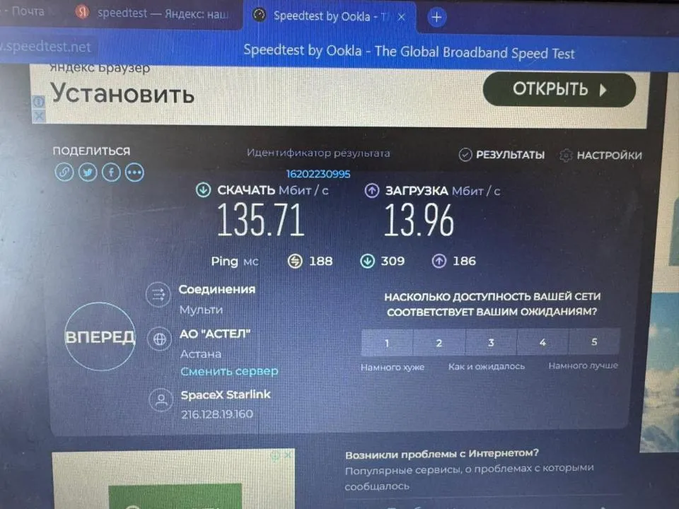 Starlink даёт хорошее качество и высокую скорость передачи сигнала от 120 мбит/с и выше. Кроме того, такой интернет прост в подключении. При этом пользоваться оборудованием от Илона Маска в Казахстане разрешено только школам.