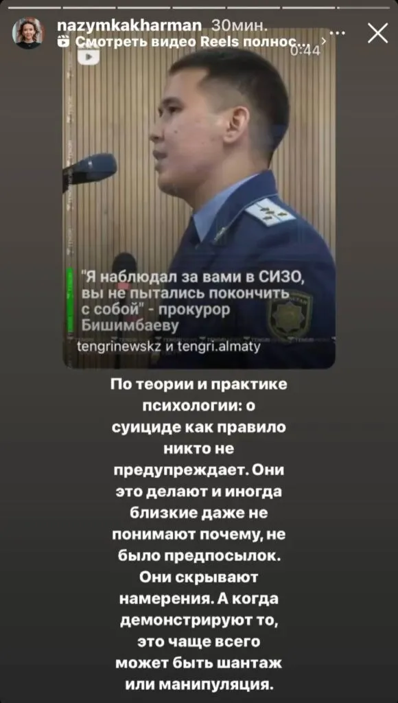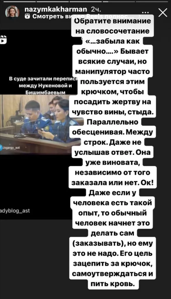 Ранее, Кахарман рассказывала, что газлайтинг Бишимбаев практиковал и будучи в браке с ней. По ее словам, распознать красные флаги в отношениях с экс-супругом и его родителями она смогла только спустя 20 лет.