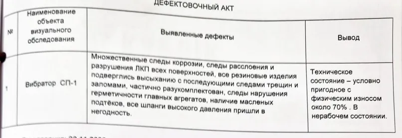 Так, например, техническое состояние вибратора СП-1 – условно пригодное. То есть физический износ составляет около 70%.