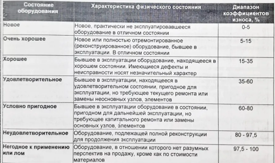 Отметим, что условно пригодное состояние подразумевает под собой оборудования пригодное для эксплуатации, но требующее текущего ремонта или замены неосновных узлов.