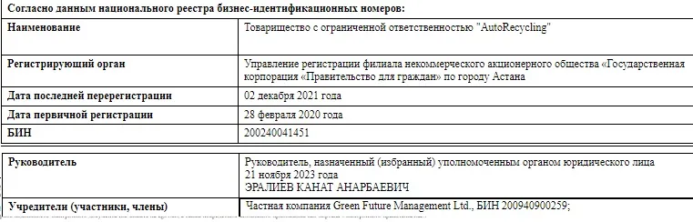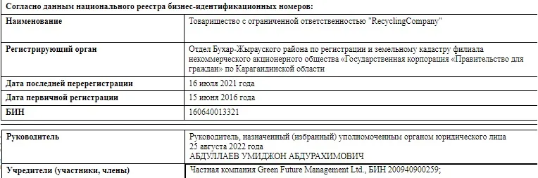Заводы (ТОО "AutoRecycling" и ТОО "RecyclingCompany") ранее принадлежали Алие Назарбаевой через частную компанию Green Future Management Ltd. Уже 7 февраля 2023 года предприятие переоформили на некоего Максата Молдашова. Отметим, что ему передали почти все компании по утилизации, которые ранее принадлежали Назарбаевой. В том числе и ТОО "Сlean City NC", которое вывозит мусор в Астане.