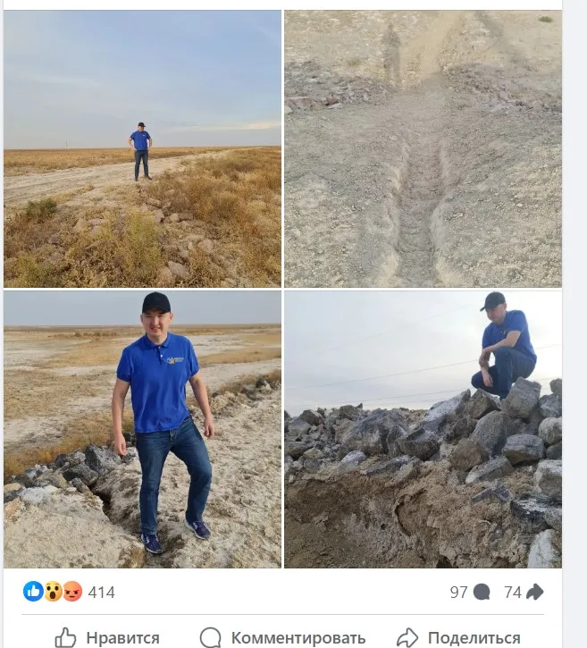 "Видите здесь дамбу высотой до 2,5 м? Нет? А она здесь есть по документам. Причем длиной 40 км. На нее в Туркестанской области в конце 2021 года потратили 2,2 млрд тенге. Проверили сооружение один раз в 2022 году, его сразу же размыло и больше дамба не использовалась. Теперь ждут, когда закончится гарантия, чтобы бросить концы в воду (парадокс)",