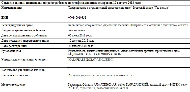 История международного автовокзала «Ушконыр» в Карасайском районе Алматинской области началась задолго до этого инцидента. Как и многое в этом регионе, актив связывали с Болатом Назарбаевым, и неслучайно. Младший брат бывшего президента действительно владел вокзалом, точнее, торговым центром. Длительное время на здание напротив авторынка «Барыс», расположенного недалеко от рынка "Алтын Орда", красовалась вывеска – торговый центр «Ушконыр».
