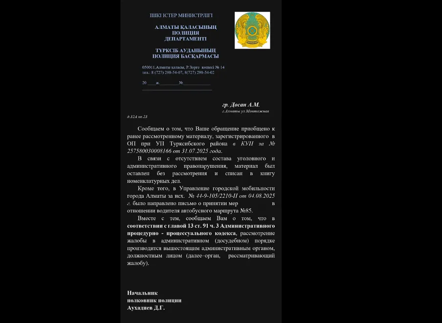 В комментариях девушке посоветовали не останавливаться и писать жалобы дальше. Тут началось самое интересное. Алина Досан рассказала корреспонденту CMN.KZ, что в день инцидента она через eOtinish подала заявления в полицию (предыдущее почему-то не зарегистрировали), Управление транспорта, акимат Алматы и Департамент по защите прав потребителей. Но Департамент полиции не нашёл состава административного правонарушения в действиях водителя. То есть, по мнению правоохранителей, он был прав?