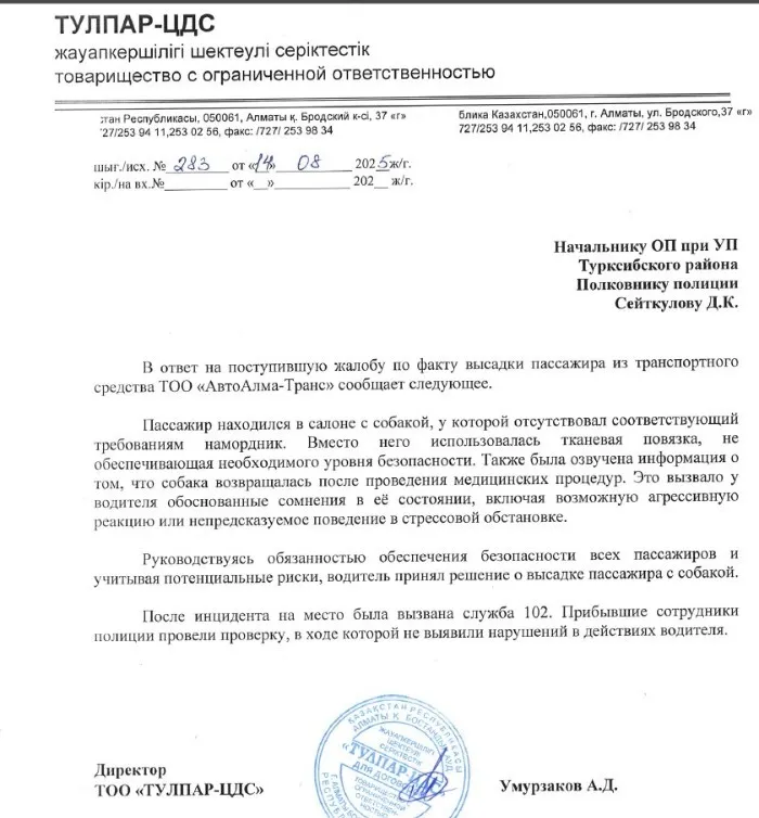 «Полицейский подтвердил наличие намордника, пытался объяснить водителю, что он не прав, но водитель упёрся... Далее мне пришлось ехать в отделение и писать заявление. Основание: нарушение должностной инструкции и приказа МИИР РК №349 от 26.03.2015 г., пункт 37:"Собаки перевозятся бесплатно, на поводке и в наморднике, на накопительных площадках". Изначально водитель утверждал, что с собакой нельзя в принципе, потом он переобулся и стал требовать, чтобы у собаки помимо намордника была внимание — ПЕРЕНОСКА, переноска для золотистого ретривера», – написала пострадавшая в Threads (орфография сохранена – прим.ред.).