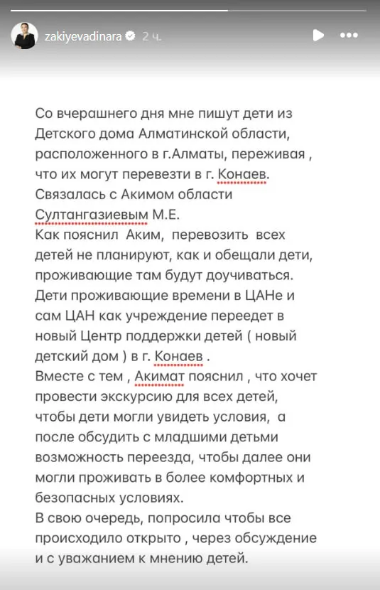 В то же время уполномоченная по правам ребёнка в Казахстане Динара Закиева написала в Instagram, что на встрече с главой региона её заверили, что перевозить всех детей не планируют.