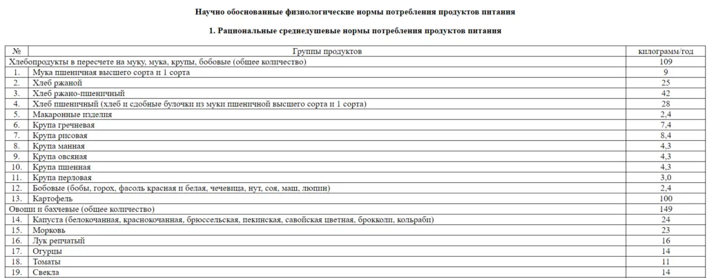 10 марта. Начнём с закупа продуктов. Министр национальной экономики РК утвердил научно-обоснованные физиологические нормы потребления продуктов питания ещё в 2016 году. В таблице указано, какие продукты и каких количествах человек должен потреблять в год, чтобы не голодать. Делим это на 12 и получаем среднемесячную норму.