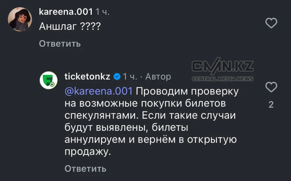 После нескольких часов ожидания в виртуальной очереди многие казахстанцы так и не смогли купить билеты — на сайте уже значился аншлаг. На фоне шквала жалоб Ticketon объявил о начале проверки на предмет возможных массовых покупок со стороны перекупщиков.