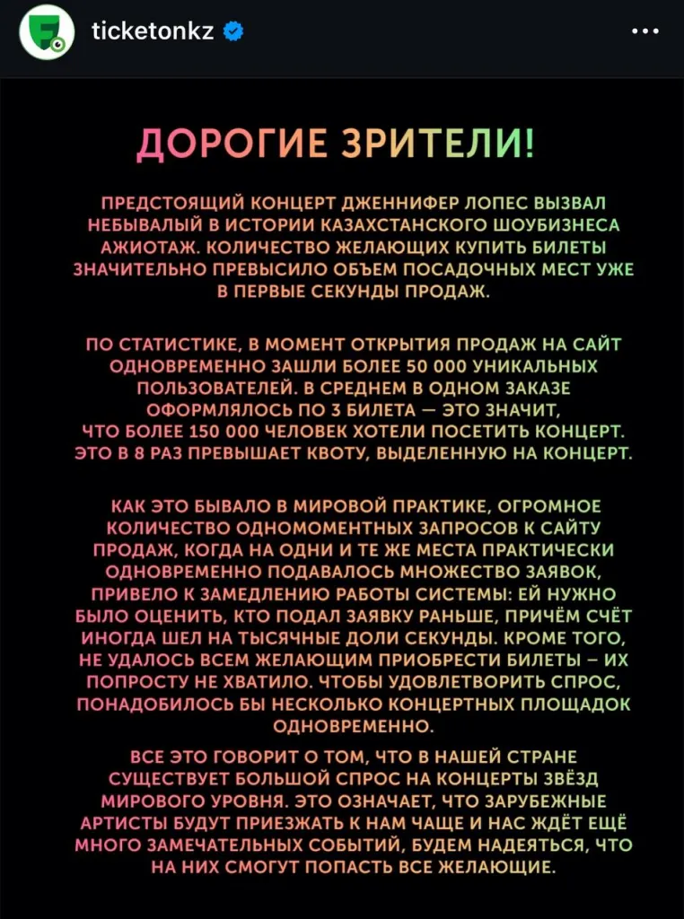 Однако не всем поклонникам Джей Ло удалось купить билеты. Уже с первых минут старта продажи пользователи начали жаловаться на сбои на сайте Ticketon: страницы не загружались, система зависала, бронирование не проходило.