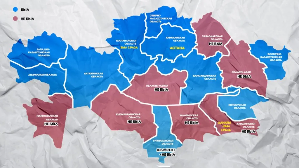 Президент совершил 14 поездок, из которых три — в Алматы, а две — в Костанайскую область. При этом глава государства оставил без внимания семь регионов и один город республиканского значения. Какие именно это регионы – можно ознакомиться в инфографике CMN.KZ.