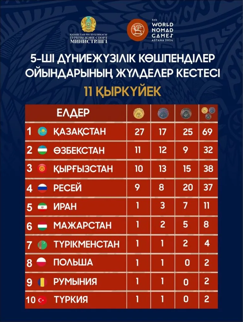 Тогызкумалак: Сборная Казахстана заняла первое место в командном зачете, в индивидуальном зачете золото у Молдир Серикқызы и Бексултана Бостандыкова, серебро у Ансаган Кожанасып и бронза у Ерсултана Әуелбай.