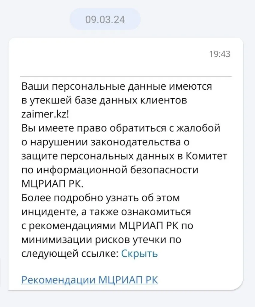 Ваши персональные данные имеются в утекшей базе данных клиентов zaimer.kz! Вы имеете право обратиться с жалобой о нарушении законодательства о защите прав персональных данных в Комитет по информационной безопасности МЦРИАП РК,