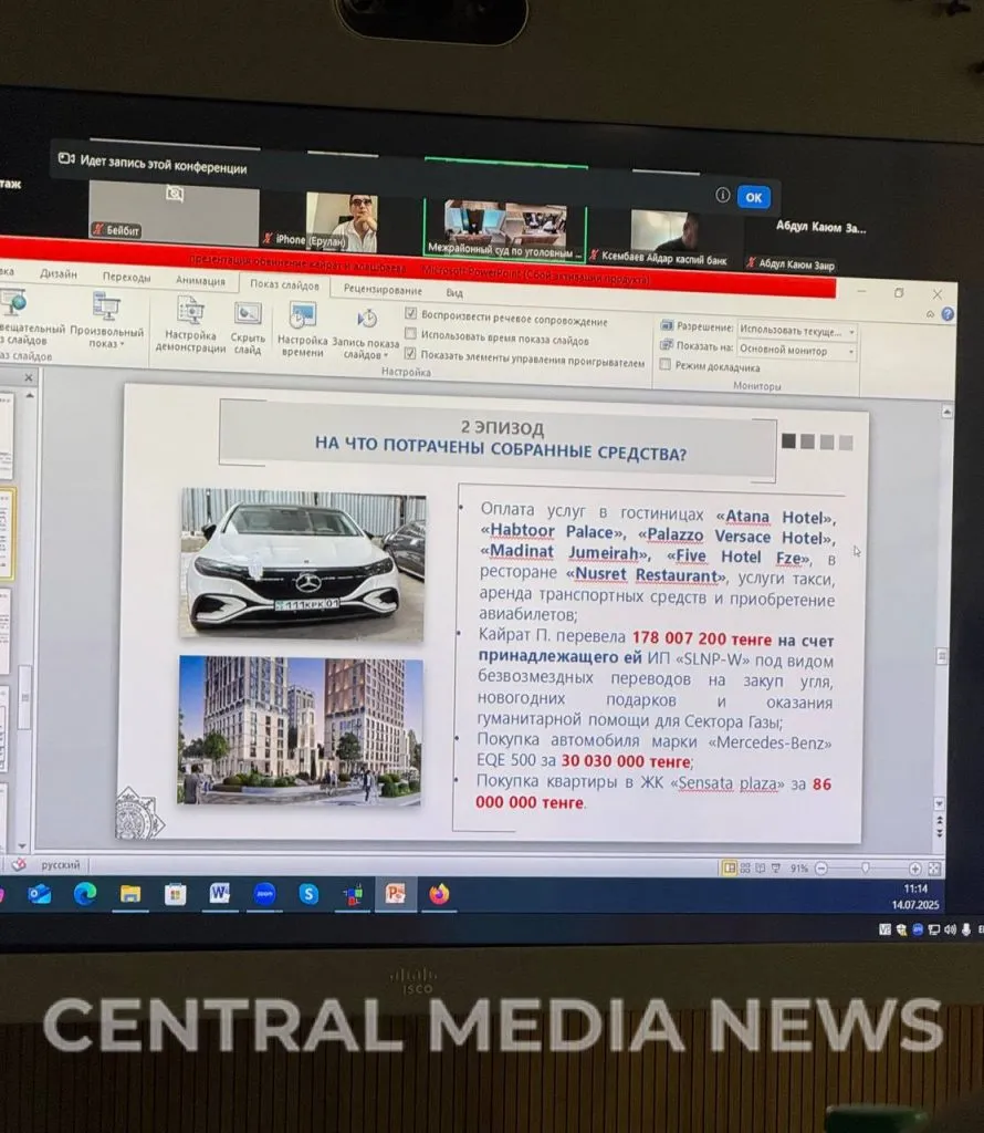 Прокуроры по резонансному делу зачитали обвинительный акт, согласно которому Перизат Кайрат собирала деньги на помощь пострадавшим в Палестине и от паводков, но тратила их на покупку жилья в ЖК Highvill Gold Ishim и Akbulak Riviera, а также на автомобиля Mercedes-Benz и роскошный отдых. Общий ущерб по двум эпизодам, по версии следствия, превысил 2,4 млрд тенге. Сама Кайрат свою вину не признаёт, сообщает CMN.KZ