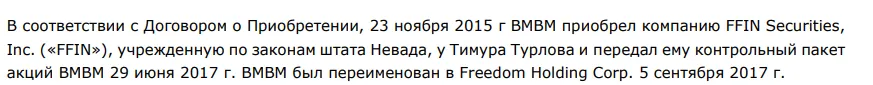 В итоге экспортировать казахстанскую нефть у владельцев BMB Munai Inc. не получилось. И у компании 5 сентября 2017 года поменялось название – FREEDOM HOLDING. После столь резкой смены имиджа бывший BMB Munai Inc ушёл с фондовой биржи, его перегистрировали в Лас-Вегасе. А после холдинг купил все активы Турлова. В 2019 году FREEDOM HOLDING оказался на Nasdaq.