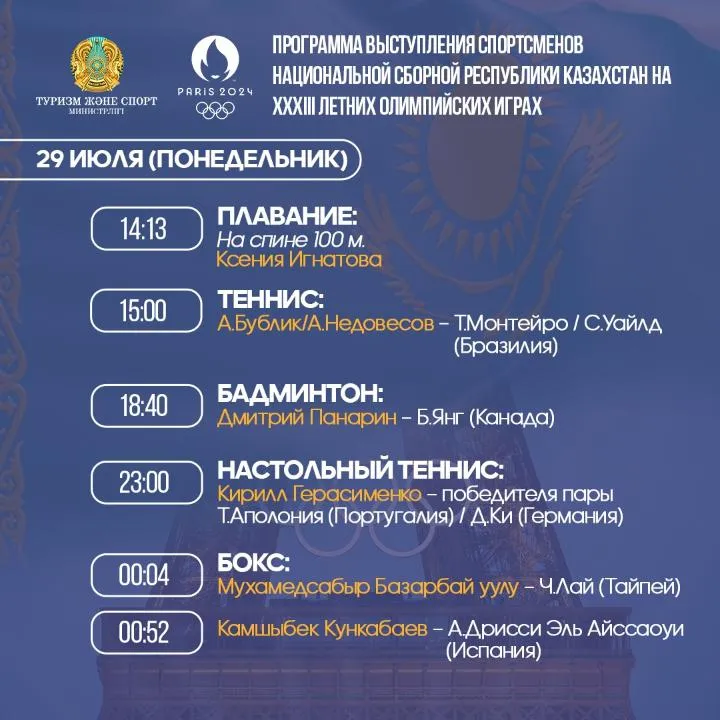 В понедельник, 29 июля, казахстанцы выступят в десяти видах спорта, сообщает CMN.KZ со ссылкой на Минтуризма и спорта