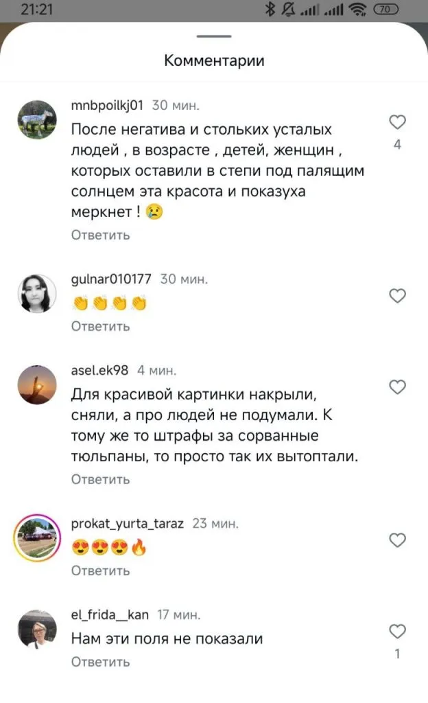 Однако, в РСК не уточнили, что всех участников из Тараза в горы привезли автобусы, организованные чиновниками. Вернулись ли все люди домой, пока неизвестно. Ну, и сами за себя говорят сотни гневных комментариев на все публикации акимата региона и других пабликов. Этакое закулисье "прекрасного" международного фестиваля тюльпанов.