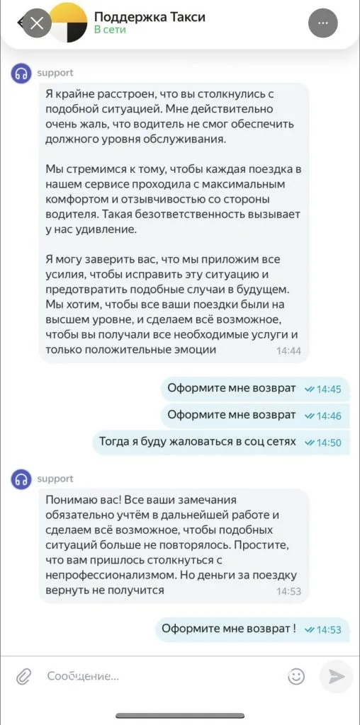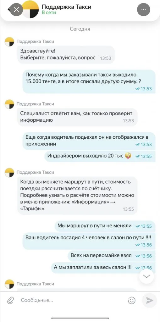 Позже она обратилась в поддержку, указав, что маршрут не менялся, а водитель по пути подбирал других людей.