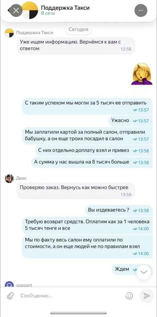 «Приехал таксист, забрал бабушку и уехал. По дороге с меня списали 8 000 тенге, потом ещё 8 000 и ещё 7 520. Плюс водитель взял по пути троих пассажиров! Мы же оплатили весь салон», – написала девушка.