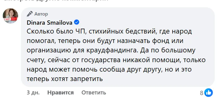 Как отмечает автор поста, в случае запрета на сбор средств физическими лицами, обычные граждане больше не смогут их объявлять. Это коснётся «лечения детей, поддержки жертв насилия или помощи людям, пострадавшим от стихийных бедствий», и т.д. Если сегодня возможен сбор средств на личные счета и оперативное привлечение помощи для конкретных людей, то с новым запретом «это будет невозможно».