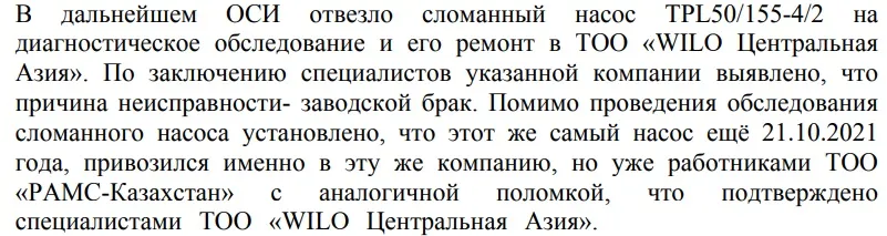 Проблемы начались в ночь с 5 на 6 декабря 2022 года. Тогда в тепловом пункте сгорел основной циркулярный насос системы центрального отопления. Пришлось подключать резервный. ОСИ Forum Residence заказал диагностическое обследование и ремонт у ТОО «WILO Центральная Азия». Там и выяснилось, что у насоса был заводской брак. Более того, сотрудники ТОО "РАМС-КАЗАХСТАН" уже привозили насос в эту же компанию с аналогичной поломкой ещё 21 октября 2021 года.