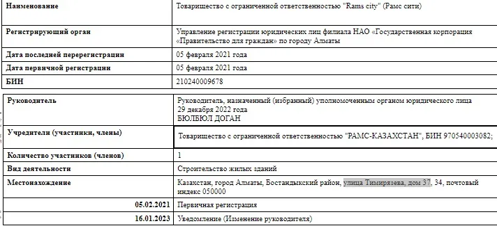 Учредителями "РАМС-КАЗАХСТАН" выступают Алмат Баимбетов и Рамазан Булбул (ранее значился как Рамазан Бюлбюл). Последний также занимает директорское кресло. У ТОО есть и дочерняя организация – ТОО "Rams city". Компания занимается строительством домов с февраля 2021 года. Руководителем значится Рамазан Бюлбюл. Оба предприятия зарегистрированы по улице Тимирязева, дом 37.