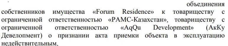 Отметим, что в сентябре в СМЭС Алматы поступило ещё одно исковое заявление от ОСИ Forum Residence о признании акта приёмки объекта в эксплуатацию недействительным. Вероятнее всего, речь идёт о документе от 29 марта 2021 года, по которому дома