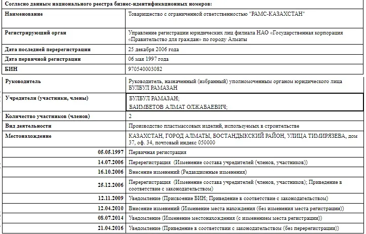 Можно предположить, что запрет несильно мешает стройкомпании, потому что последние коррективы владельцы ТОО вносили ещё в 2016 году. Тогда приводили данные в соответствии с законодательством (без перерегистрации).