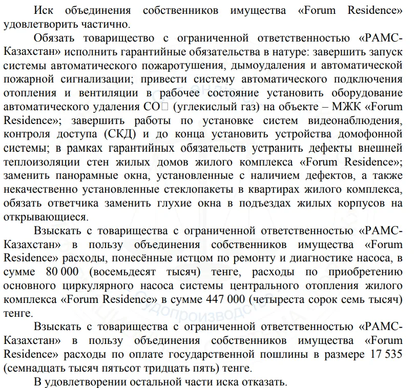 В Специализированном межрайонном экономическом суде Алматы доводы застройщика не приняли. 14 марта 2024 года суд частично удовлетворил иск ОСИ Forum Residence и обязал стройкомпанию исполнить гарантийные обязательства. С ТОО «РАМС-КАЗАХСТАН» взыскали деньги за диагностику и ремонт, а также за приобретение основного циркулярного насоса. ОСИ отказали в оплате расходов за исследование по утеплению фасадов.