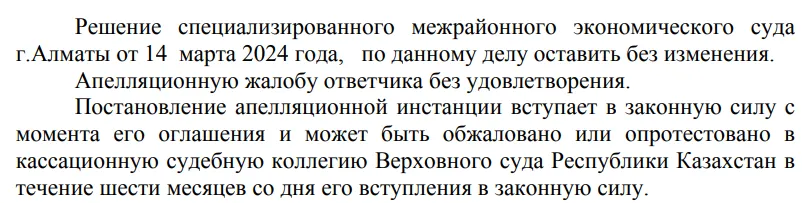 10 июня 2024 года Алматинский городской суд отказал в апелляционной жалобе ответчика и оставил решение первой инстанции в силе.