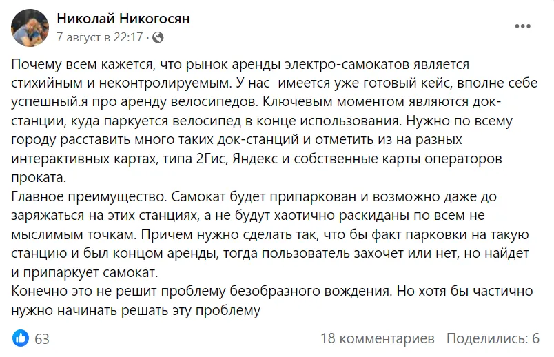 }}Пользователь Facebook Николай Никогосян считает, что примером контроля рынка аренды самокатов может стать решение с арендой велосипедов. Как отмечает сам комментатор, “ проблему вождения это не решит”. Но хотя бы организует парковки из стихийных самокатных свалок.