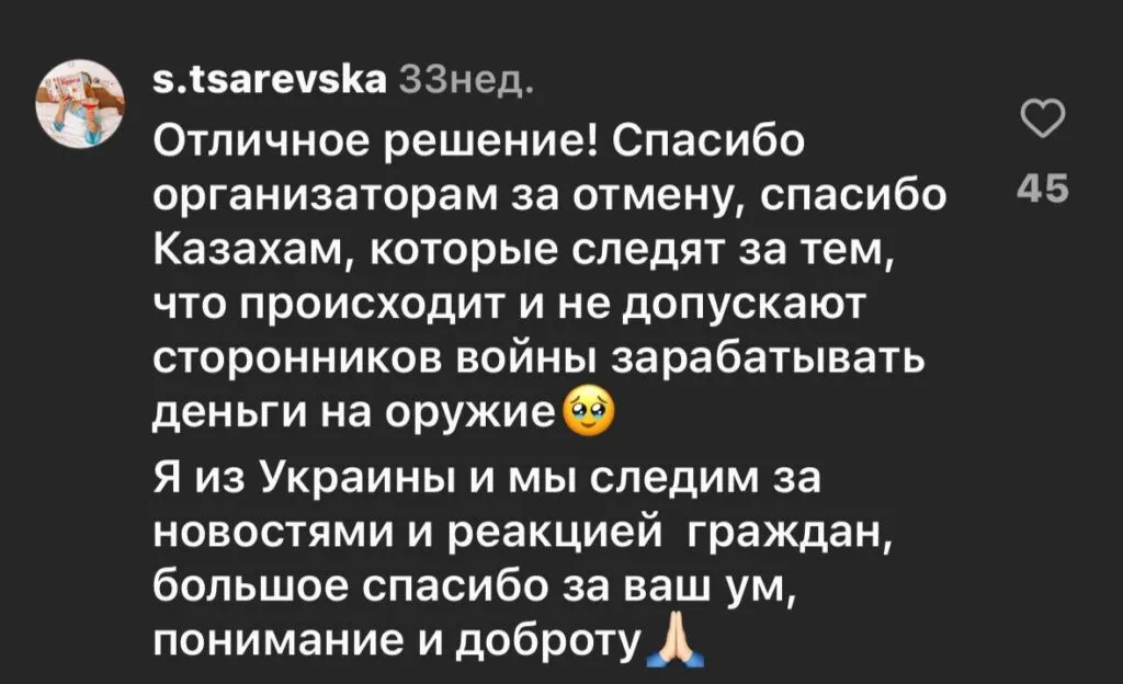 Так, например, после многочисленных просьб отменили концерт Полины Гагариной, который планировался на февраль 2023 года. Казахстанцы выступали против мероприятия артистки после её участия в концерте в честь годовщины присоединения Крыма.