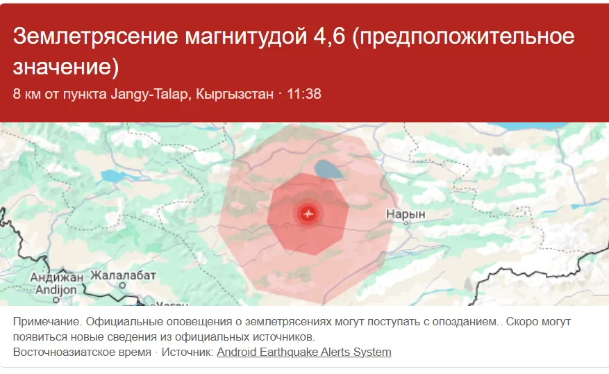 По информации ДЧС города очаг землетрясения располагался на территории Кыргызстана в 239 км на юго-запад от мегаполиса: