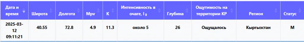 Согласно информации казахстанского Центра данных ИГИ НЯЦ РК землетрясение произошло на территории Кыргызстана 12 марта 2025 года в 08:11 утра по времени Астаны (в 03 час. 11 мин. по Гринвичу).