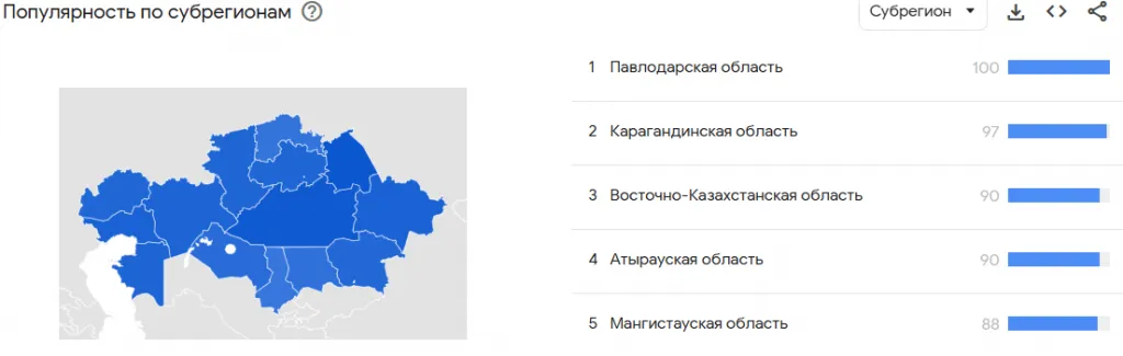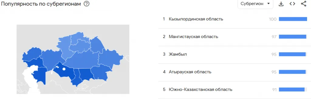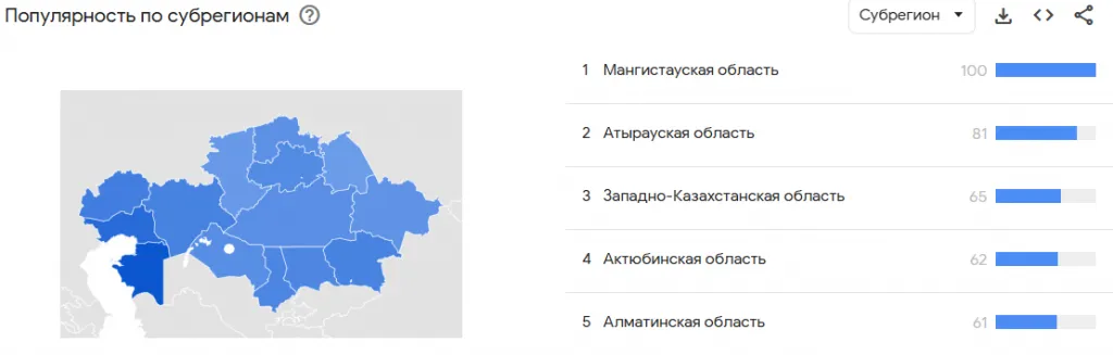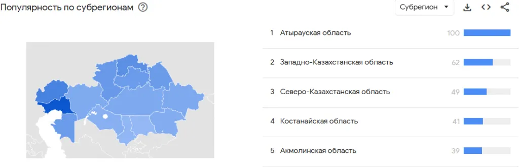 Согласно данным Google Trends, чаще всего о паводках искали информацию в Атырауской, Западно-Казахстанской и Северо-Казахстанской областях, где ситуация была особенно тяжёлой.