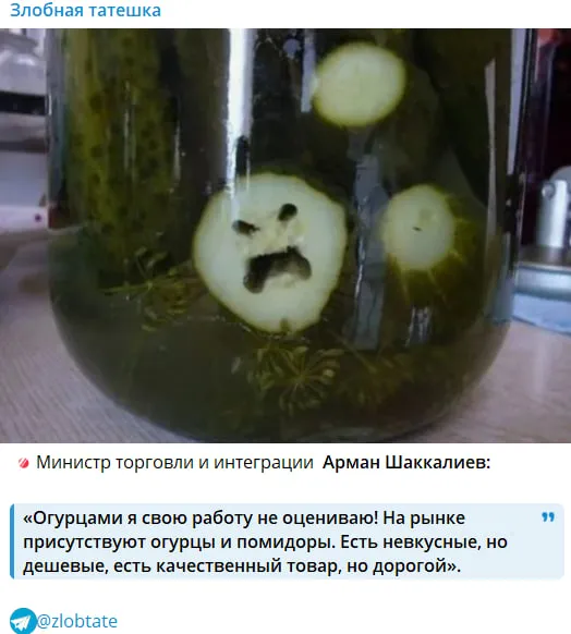 -text {"mediaId":65379,"mediaLink":"https://cmn.kz/?attachment_id=65379","mediaType":"image"}«Огурцами я свою работу не оцениваю. На рынке присутствуют огурцы и помидоры. Есть вкусные, но дорогие, есть невкусные, но дешевые. Это и есть рынок. Есть качественный товар, но дорогой. Есть товар среднего качества. А качество — это понятие субъективное», — сказал он.
