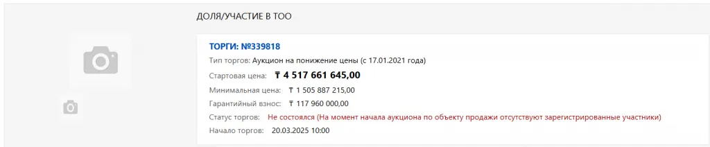 Ранее редакция уже рассказывала про Аксуский сахарный завод. Его решили продать 4 марта, именно тогда часть актива выставили на торги, которые должны были состояться сегодня, 20 марта в 10:00. Но на момент начала аукциона на понижение, желающих приобрести завод не нашлось.