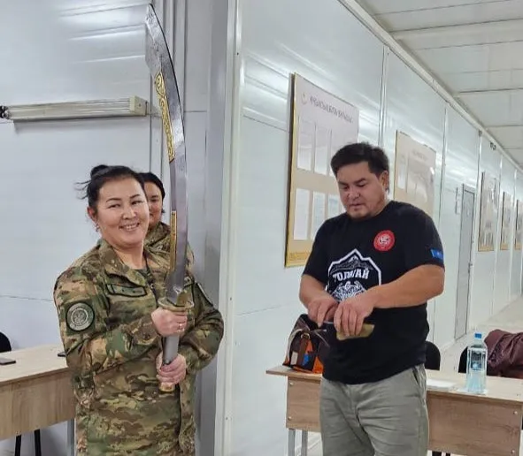 }}Лейтенант Алия Абдигалиева, продержавшая стальной меч более минуты, получила в подарок “железное сердце”. Рекордсмен сделал его из железного гвоздя и подарил ей на память.