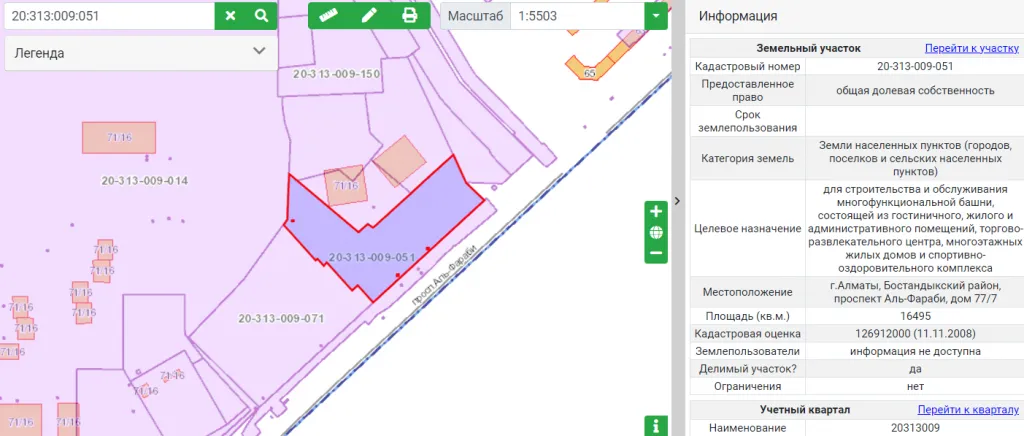 Земельный участок по проспекту Аль-Фараби, дом 77/7 занимает площадь 1,6495 га. Это общая долевая собственность. Целевое назначение – для строительства и обслуживания многофункциональной башни, состоящей из гостиничного, жилого и административного помещений, торгово-развлекательного центра, многоэтажных жилых домов и спортивно-оздоровительного комплекса.
