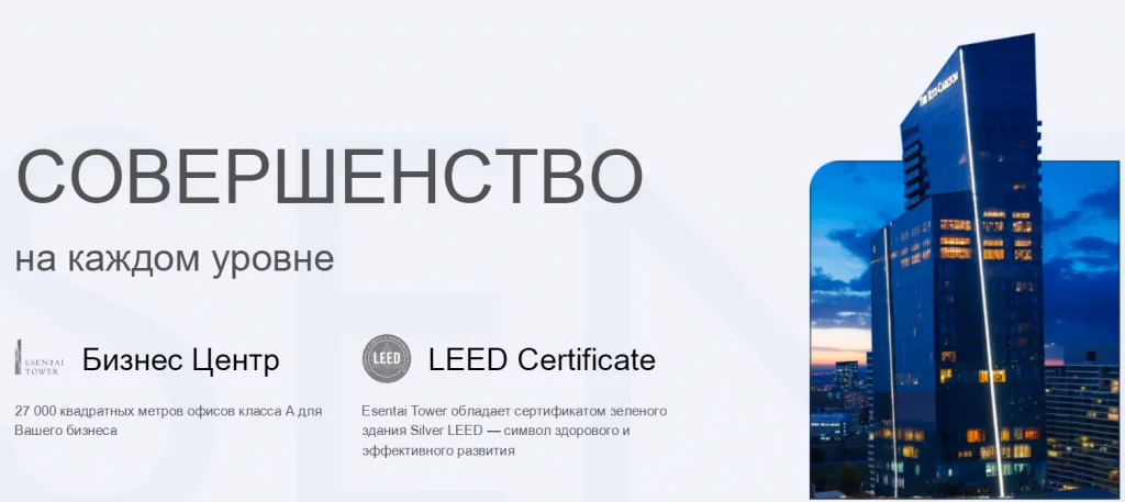 По данным официального сайта Esentai Tower, арендуемая площадь под офисы занимает 27 тысяч квадратов. В многофункциональный комплекс в 360 тысяч кв. метров, помимо самого бизнес-центра, входит Esentai Square, Esentai Mall, отель The Ritz Carlton, обслуживаемые апартаменты и Esentai Park.