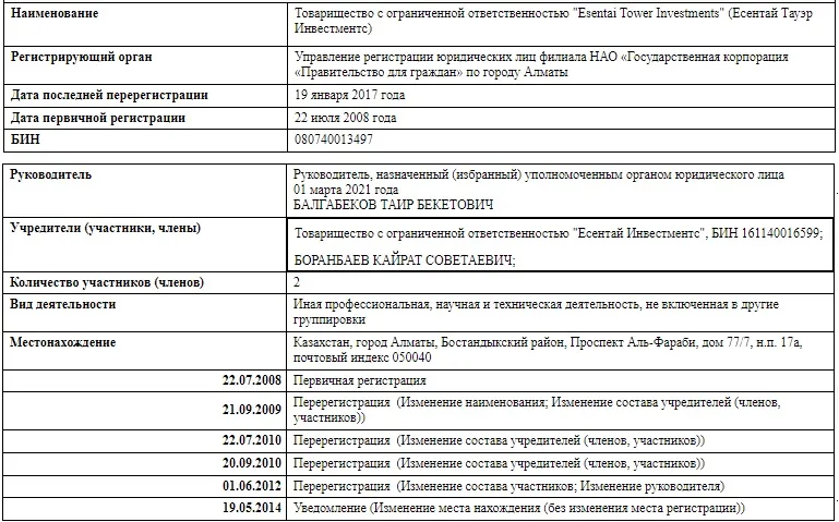 Владельцем здания значится компания CAPITAL TOWER DEVELOPMENT. В "Правительстве для граждан" найти предприятие с таким наименованием не получится. За то есть ТОО "Кэпитал Тауэр Девелопмент". Учредителем организации значится ТОО Esentai Tower Investments (Есентай Тауэр Инвестментс). А уже им владеет сам Кайрат Боранбаев и ТОО "Есентай Инвестментс" (Сержан Жумашов, Эркек Мехмет Эркан и Оймен Гюрсель Бурак). 50% от Esentai Tower и Esentai Mall Боранбаев приобрёл в 2016 году.