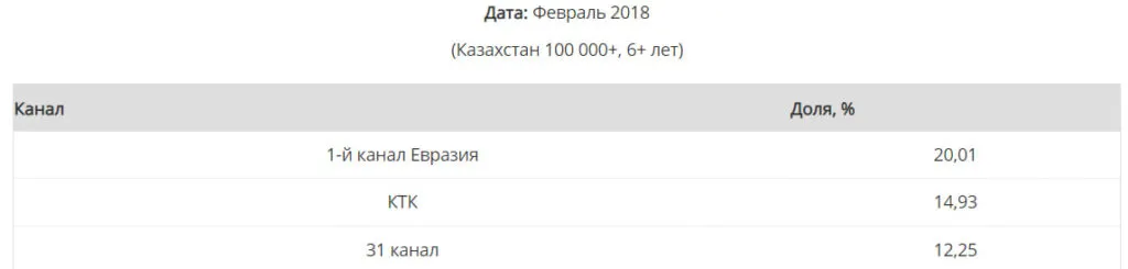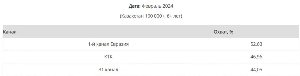 Исследовательская компания TNS Central Asia выяснила, что с 2018 по 2024 год самыми популярными телеканалами среди казахстанских зрителей были «КТК», «Первый канал Евразия» и «31 канал».