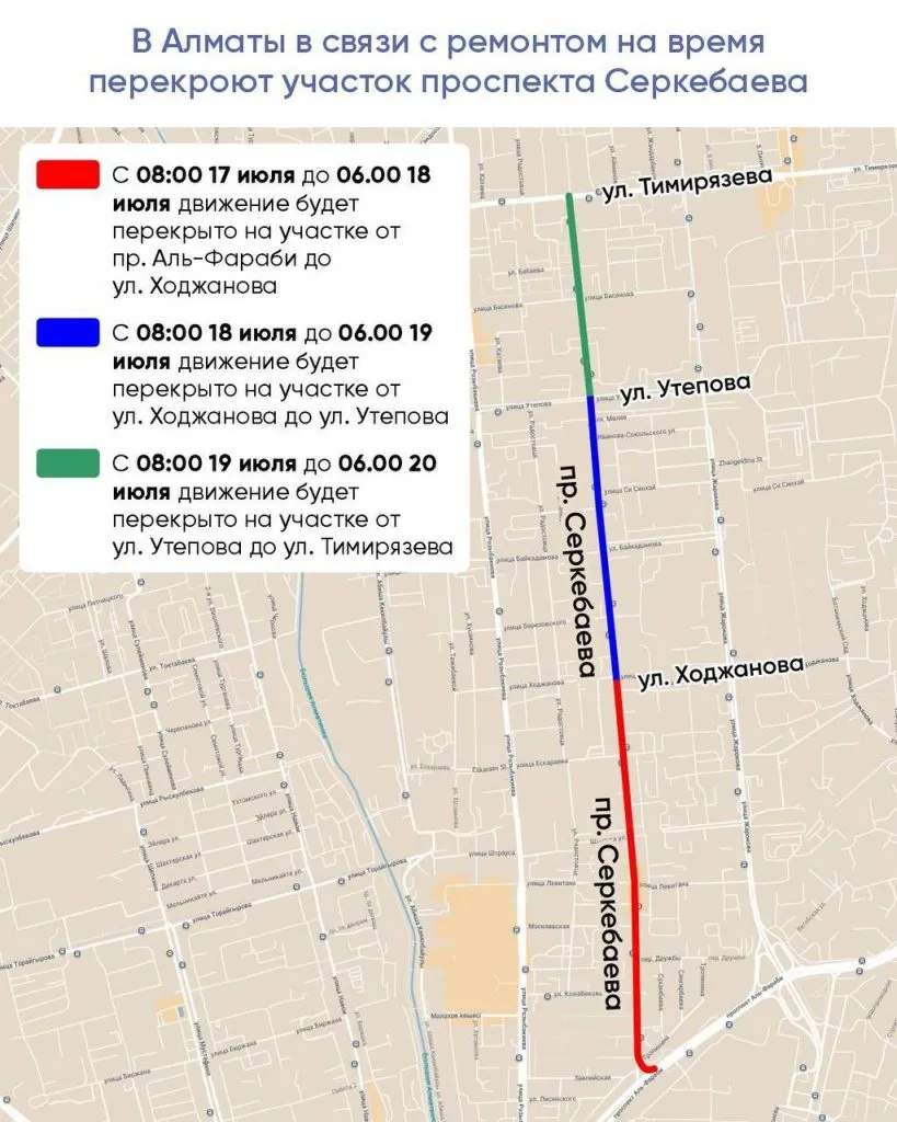 - с 08:00 17 июля до 06:00 18 июля движение будет перекрыто на участке от проспекта Аль-Фараби до улицы Ходжанова;