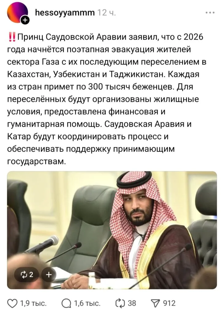 Соцсети взорвало сообщение от якобы наследного принца Саудовской Аравии, который заявил: в 2026 году жители сектора Газа будут поэтапно переселяться в Казахстан и соседние страны. В МИД РК опровергли новость.
